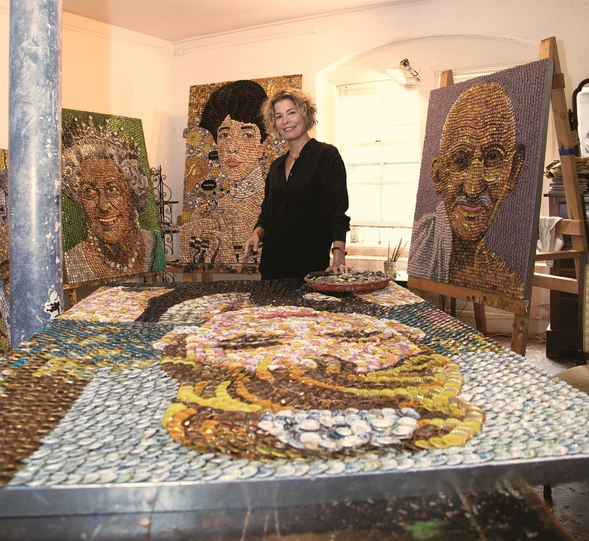 Molly B. Right specializes in oversized mosaic-like portraits made from vintage bottle caps. Right is a self-taught artist. She began by painting small paintings, often on pieces of scrap metal or lumber that she found. The subject matter ranged from vignettes of her childhood to minimalist figurative works. She made her leap from narrative paintings to bottle cap portraits in 2002.